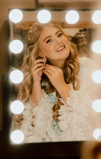 A young woman with long, wavy blonde hair, wearing a tiara and a white dress with ruffled sleeves, is smiling and adjusting an earring in front of a mirror surrounded by bright vanity lights.