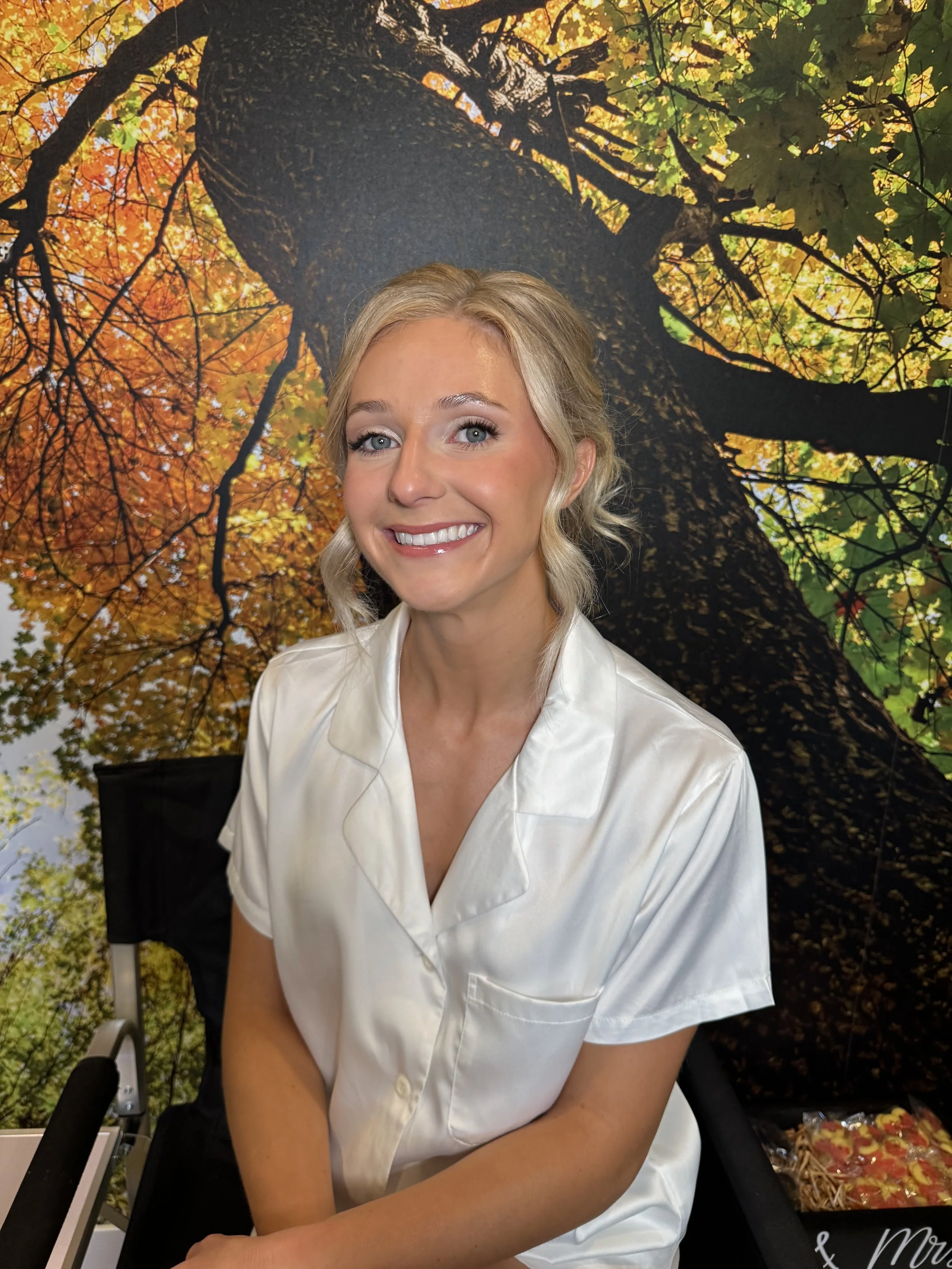 A woman with blonde hair and blue eyes sits smiling in front of a large tree with colorful autumn leaves, wearing a white satin shirt.