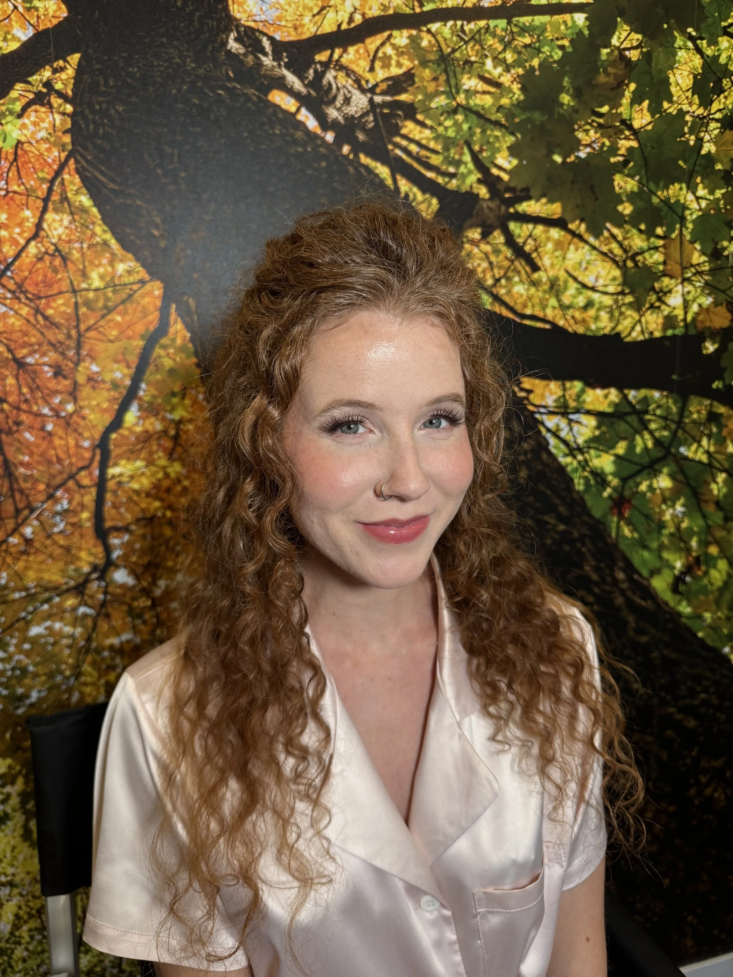 A woman with curly red hair and fair skin, wearing a cream-colored satin shirt, sitting in front of a backdrop of a large tree with fall foliage.