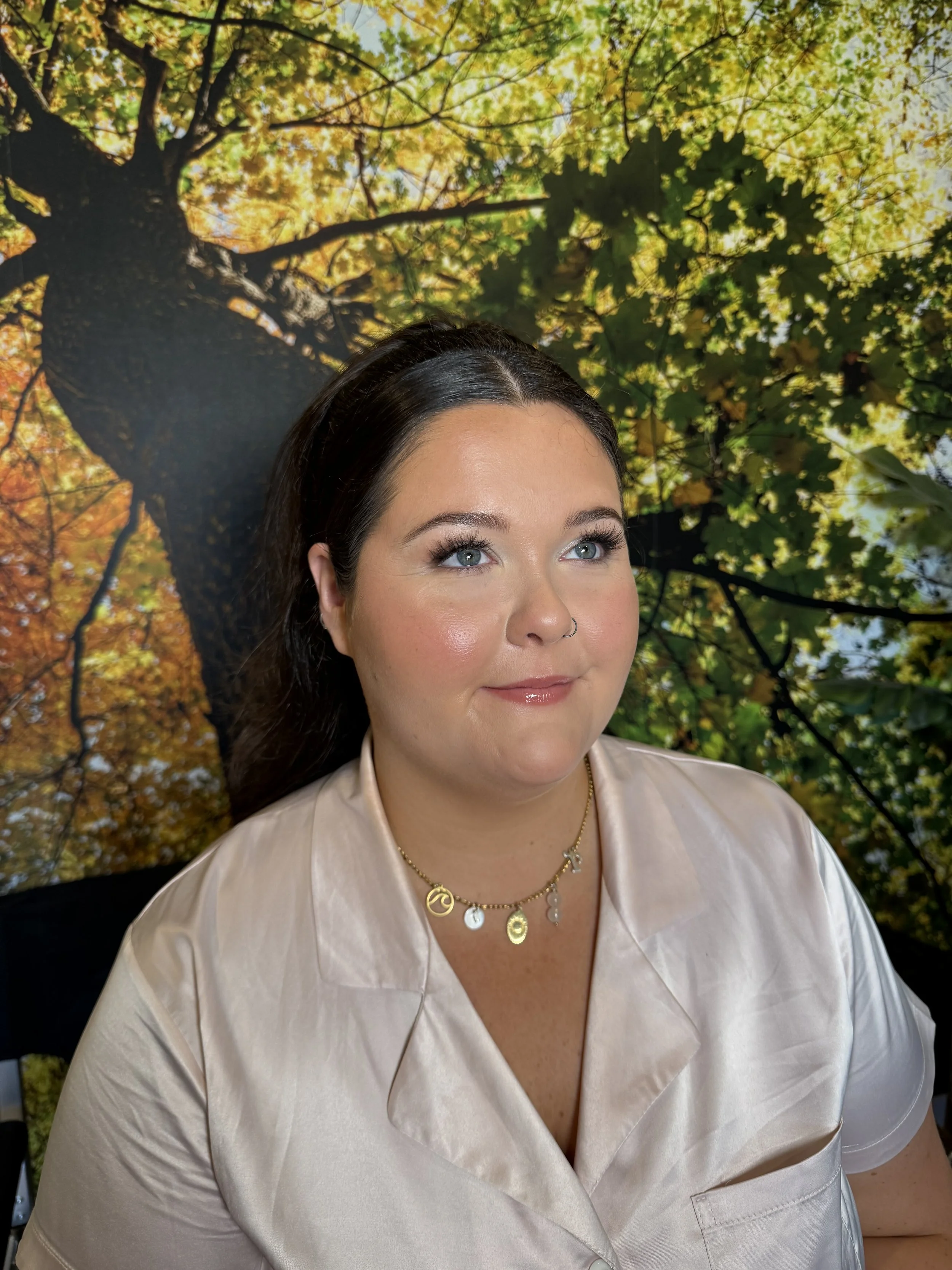 A woman with dark hair, blue eyes, and a nose ring, wearing a light-colored satin blouse and layered gold necklaces, sitting in front of a backdrop of a tree with autumn leaves.