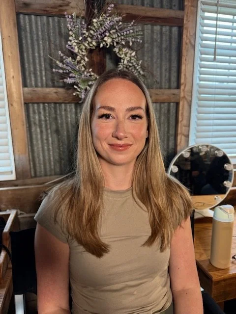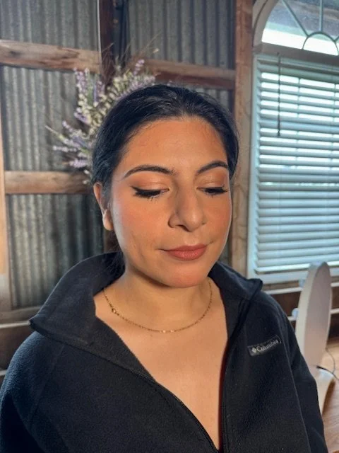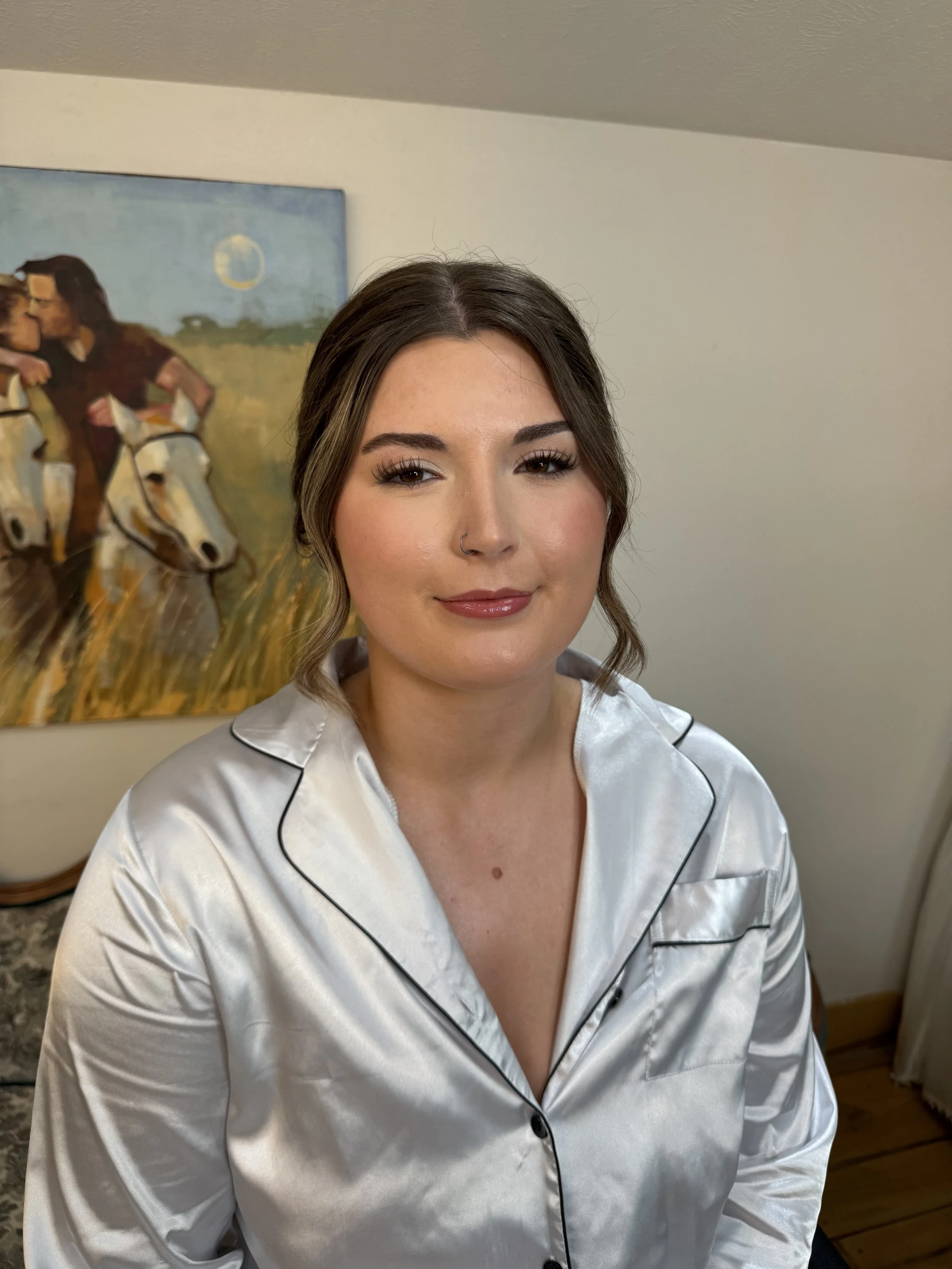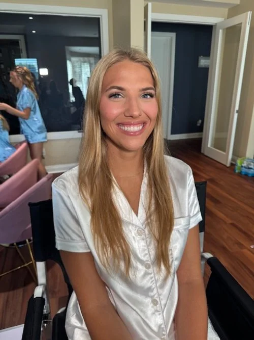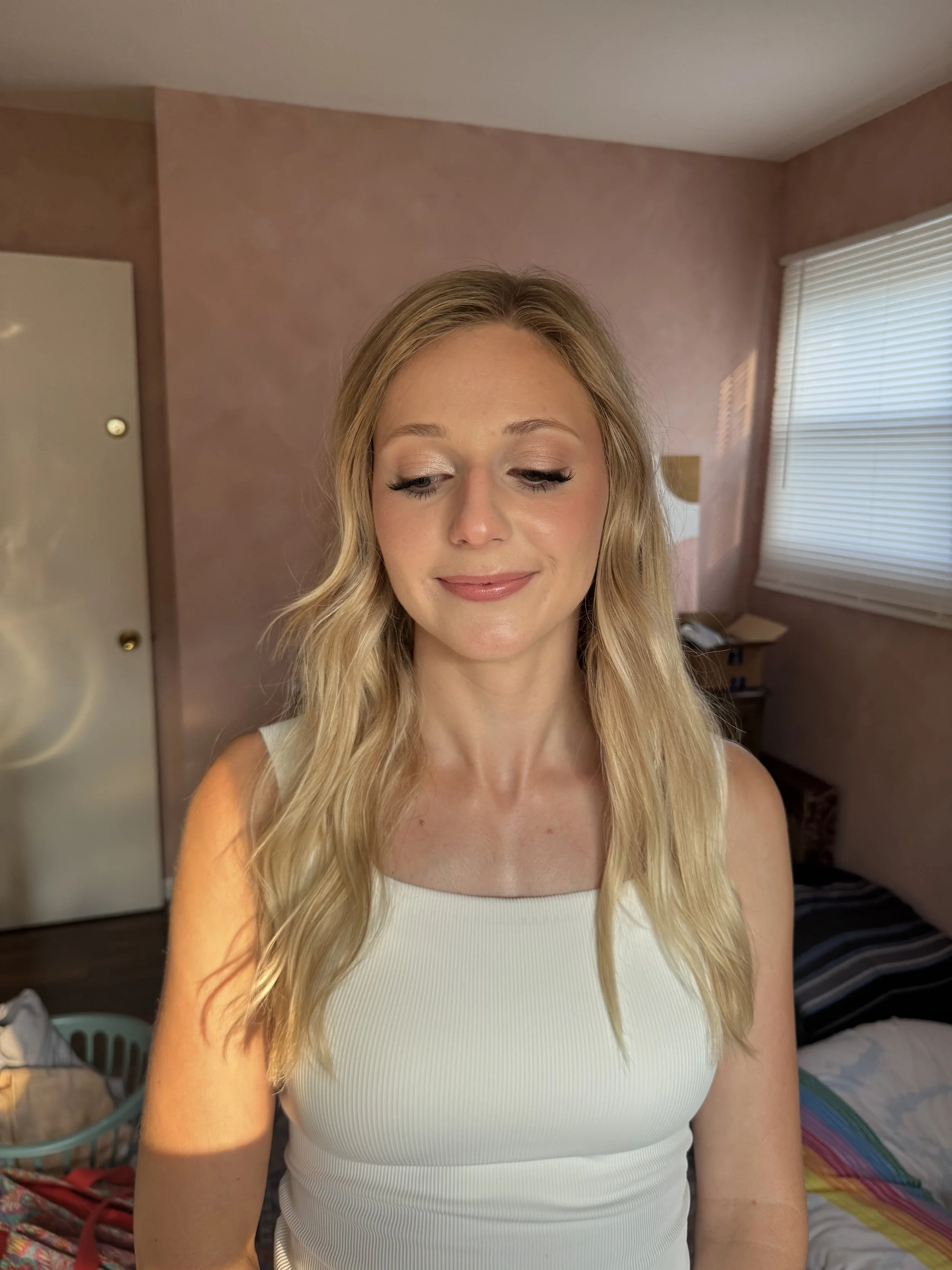 Before and after images of a woman showing a transformation with makeup and styling, with the left side featuring her with no makeup and the right side with makeup, styled hair, and a bright smile.