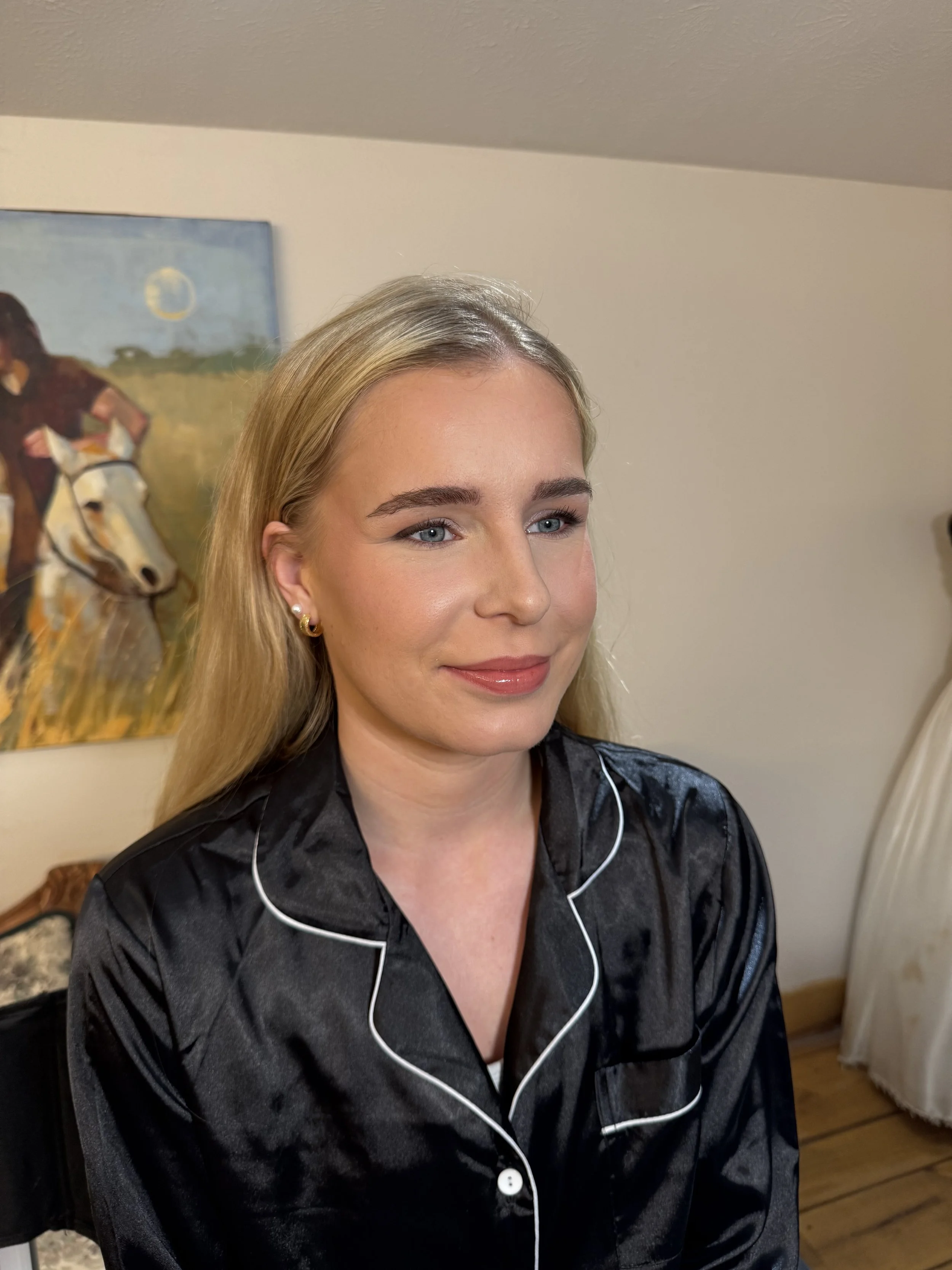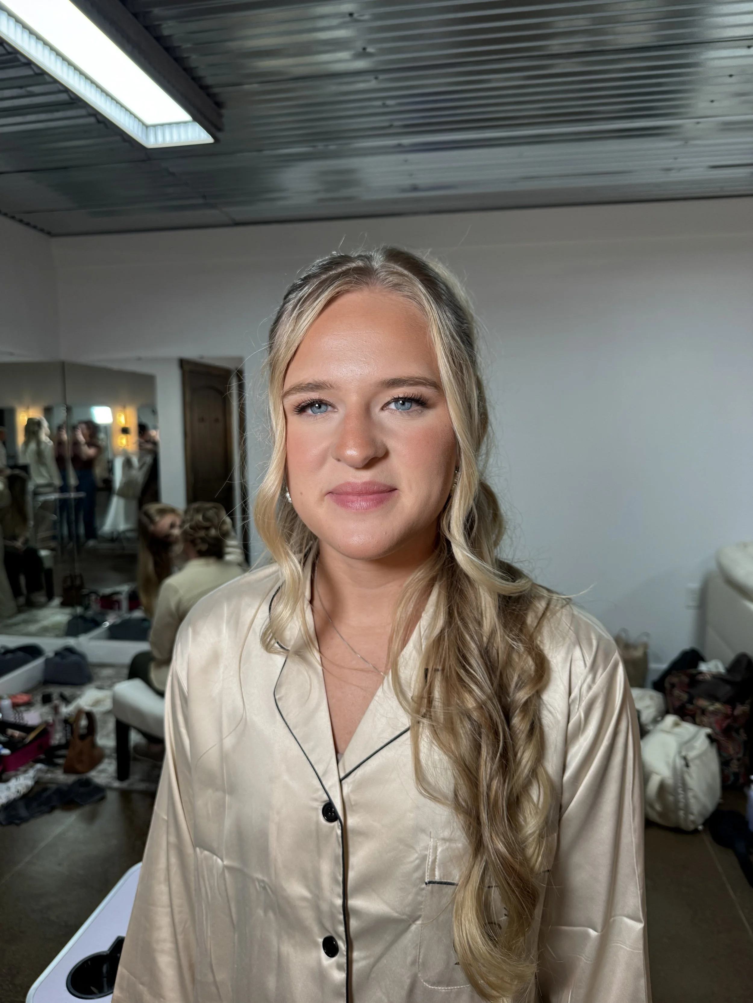 A young woman with blonde hair styled in loose curls, wearing a light blue satin pajama top, smiling widely.