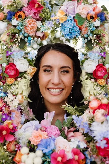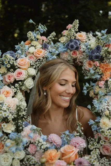 Smiling woman with long, wavy hair, wearing pearl earrings and a white dress, standing behind a large floral wreath with pink and white roses, blue and purple flowers, and greenery, outdoors with blurred trees in the background.