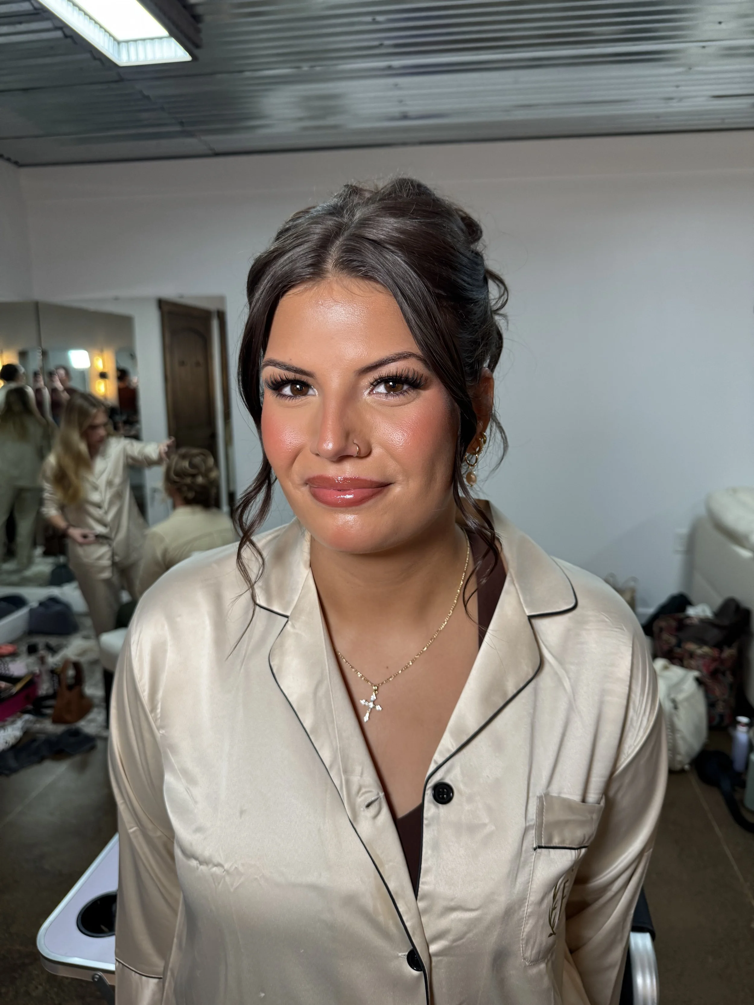 A woman with dark brown hair styled in loose waves, wearing a beige satin pajama top with black piping, gold jewelry including a cross necklace and earrings, is smiling softly at the camera in a room with a mirror, makeup, and other people in the bac