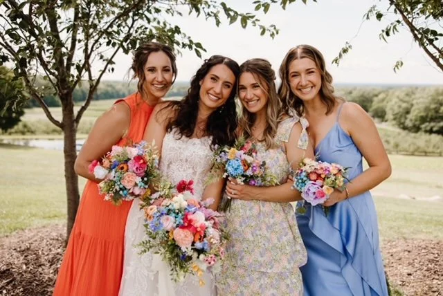 Four women standing outdoors, smiling, holding bouquets of colorful flowers, with trees and a grassy field in the background.