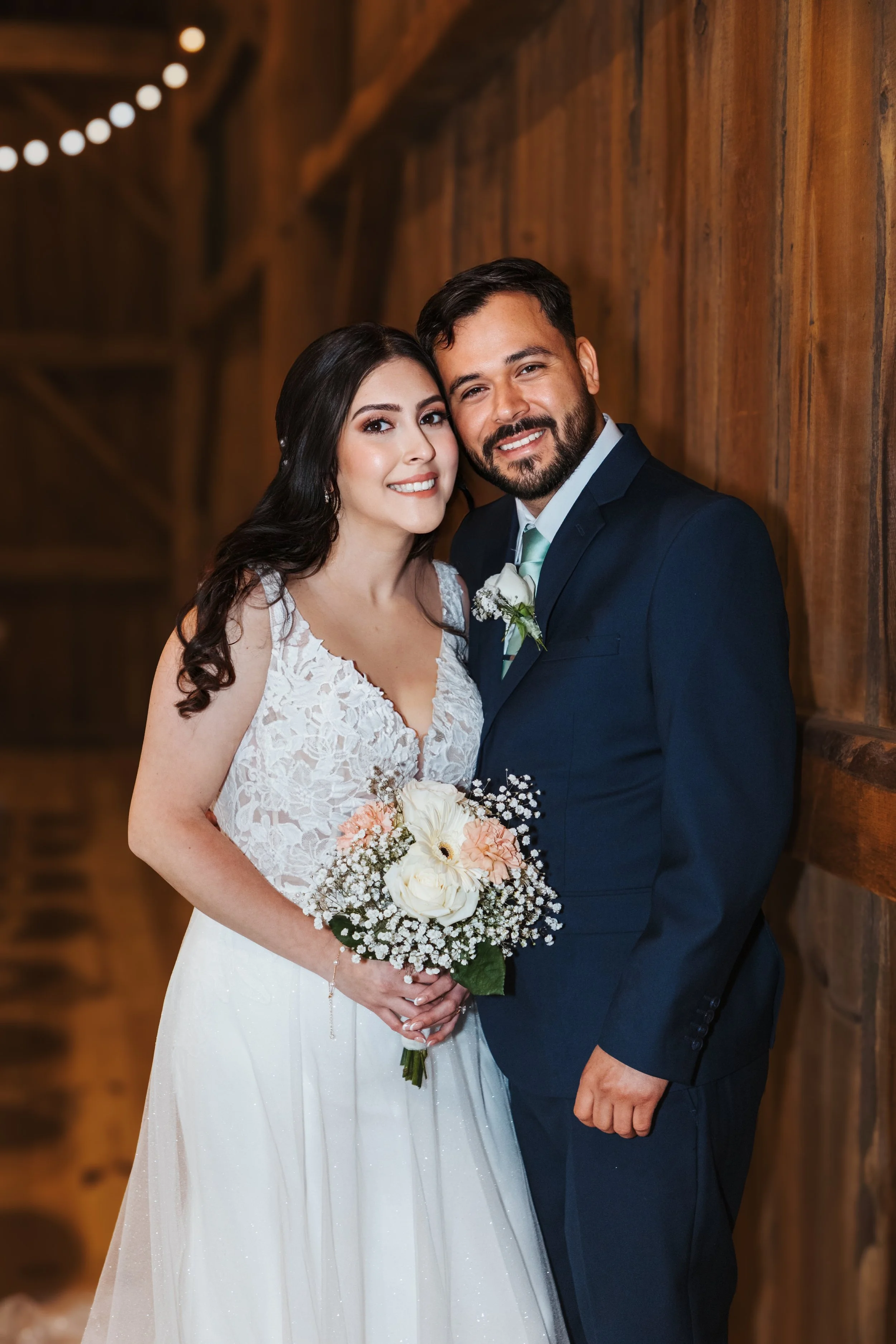 A bride and groom on their wedding day, with the groom leaning in close to the bride, who holds a bouquet of flowers.