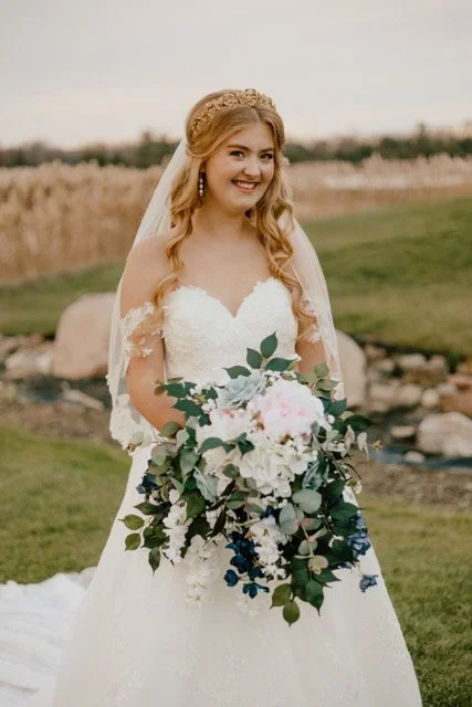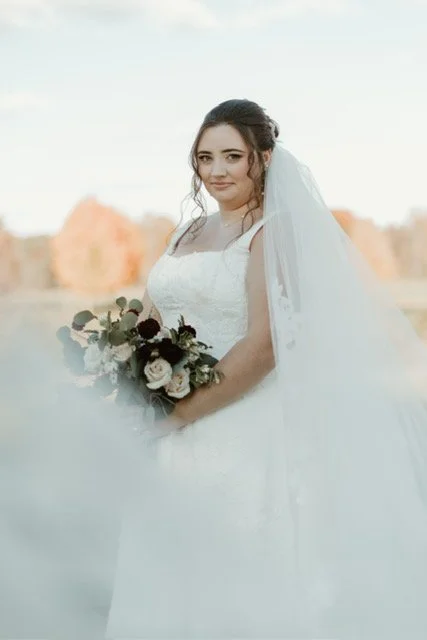 A bride in a white wedding gown and veil holding a bouquet of flowers outdoors with trees in the background.