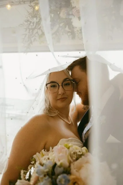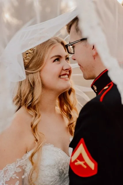 A bride and groom face each other under a veil, smiling and looking into each other's eyes, outdoors with a blurred background.