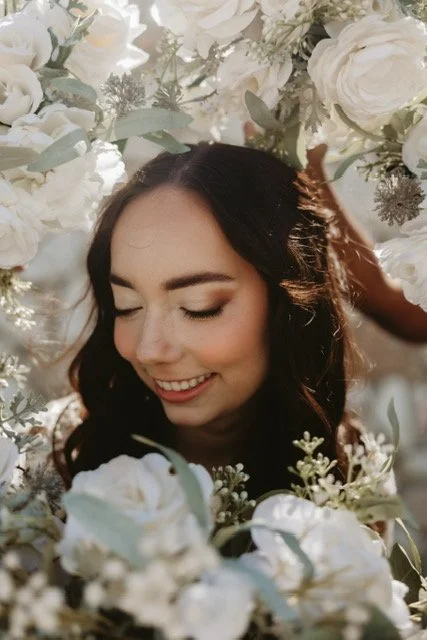 A woman with dark hair smiling among white flowers, possibly at a wedding or photoshoot