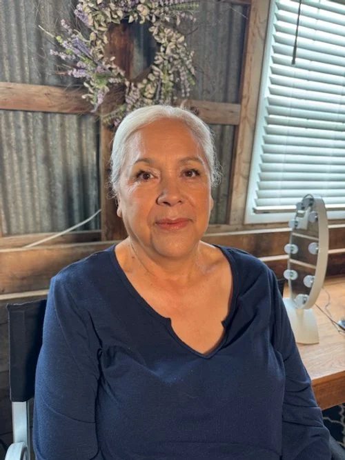 An older woman with short gray hair and a navy blue top sitting indoors near a window with blinds, with decorative flowers and rustic decor in the background.